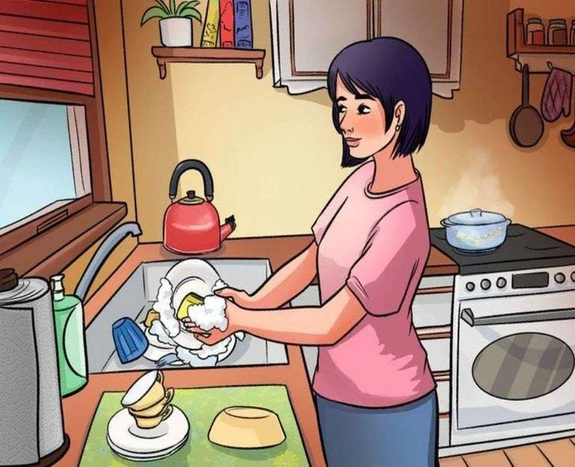 Teraz czas na Twoje wyzwanie! Przed Tobą scena z kuchni, która wydaje się na pierwszy rzut oka całkowicie normalna. Kobieta myje naczynia, coś bulgocze na kuchence, a jasnoczerwony czajnik spoczywa obok zlewu. Ale... coś tu jest nie tak!